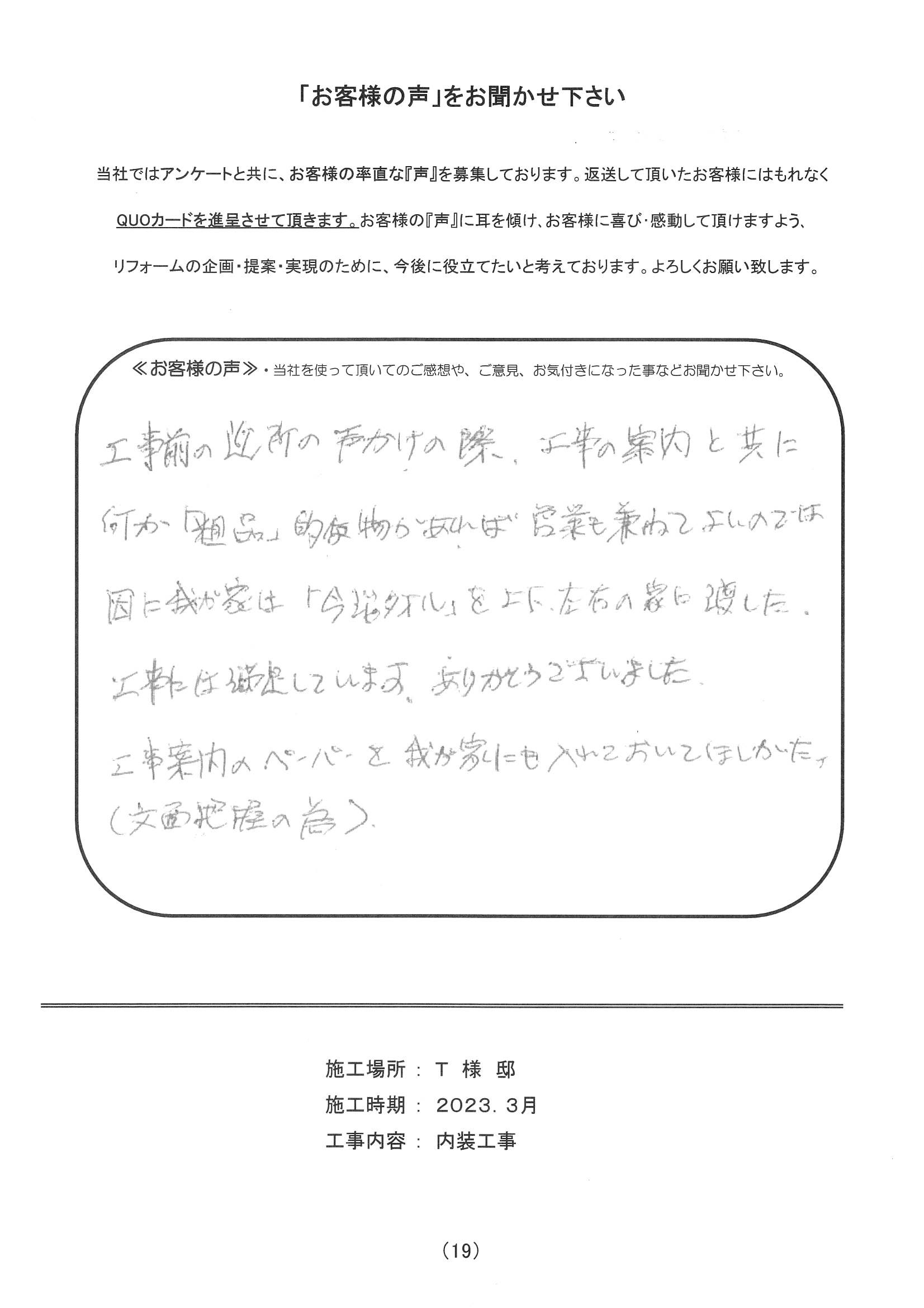 工事前の近所の声かけの際、工事の案内と共に何か「粗品」的な物があれば営業も兼ねてよいのでは。因に我が家は「今治タオル」を上下左右の家に渡した。工事には満足しています。ありがとうございました。工事案内のペーパーを我が家にも入れておいてほしかった。(文面把握の為)