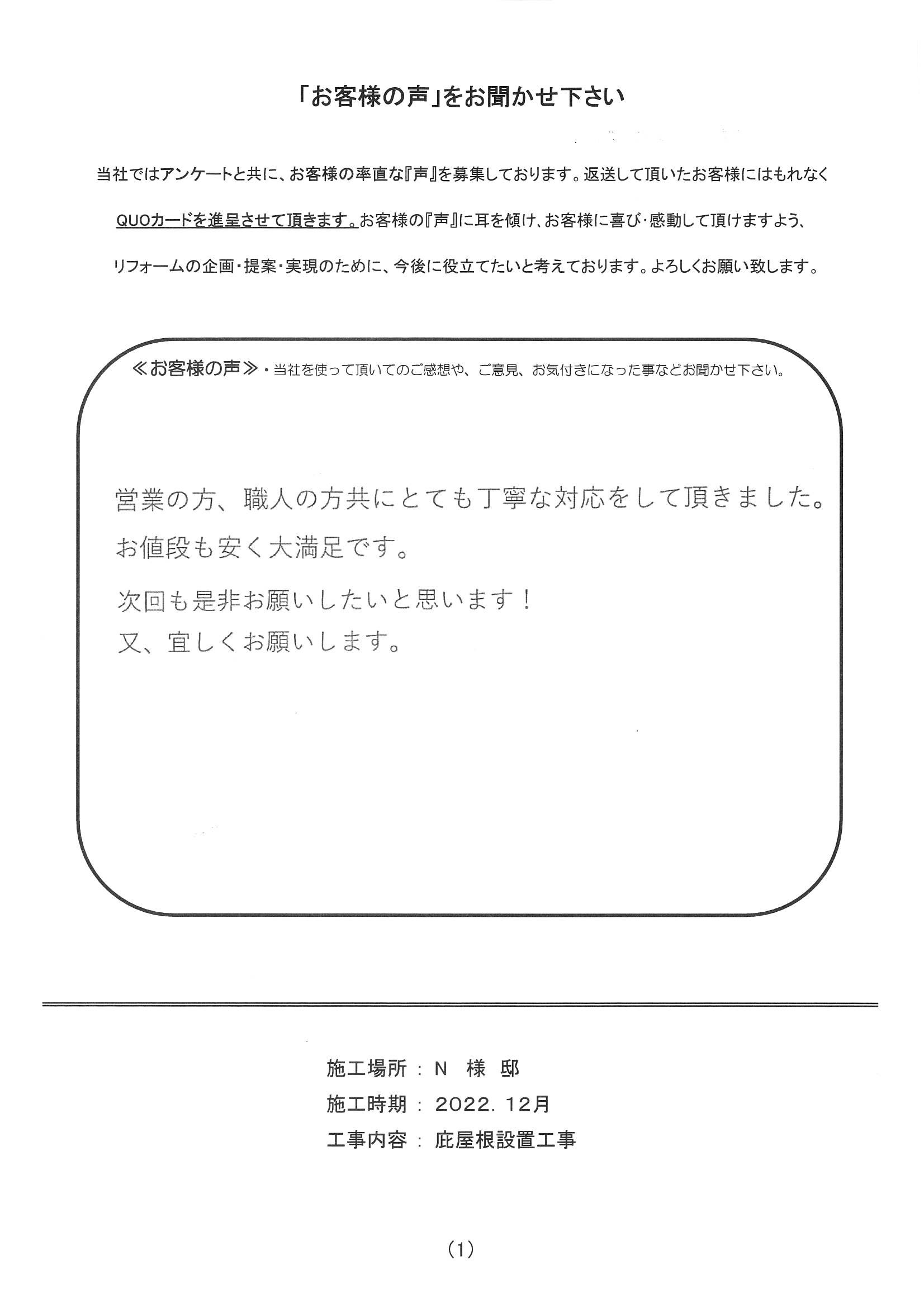 営業の方、職人の方共にとても丁寧な対応をして頂きました。お値段も安く大満足です。次回も是非お願いしたいと思います!又、宜しくお願いいたします。