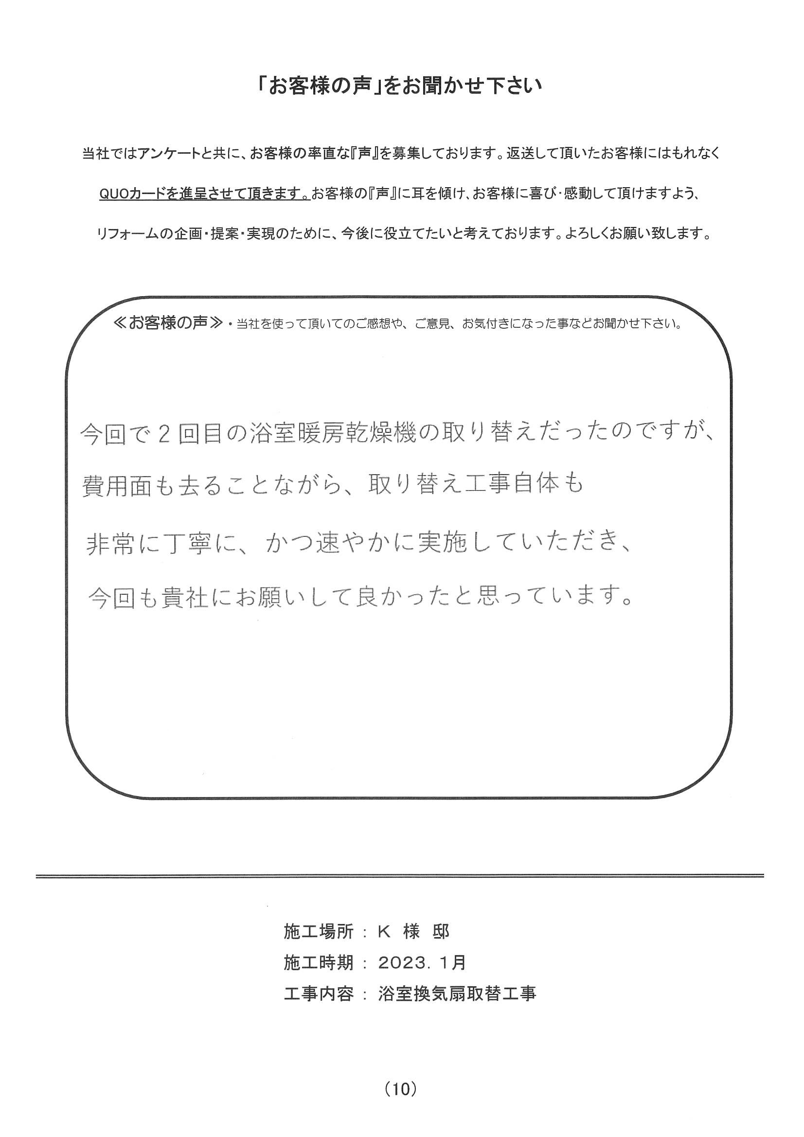 今回で2回目の浴室暖房乾燥機の取り替えだったのですが、費用面も去ることながら、取り替え工事自体も非常に丁寧に、かつ速やかに実施していただき、今回も貴社にお願いして良かったと思っています。