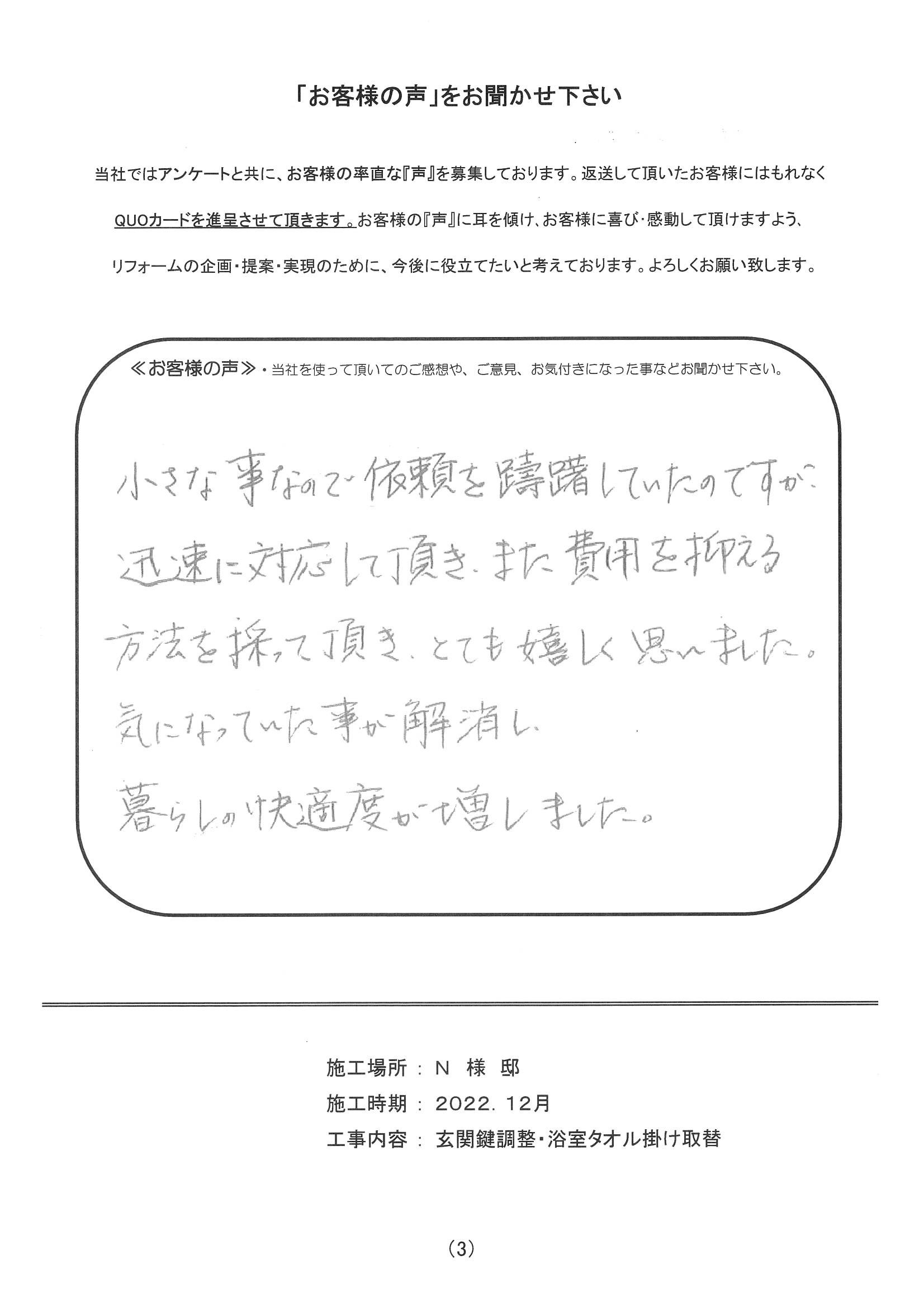 施工場所 N様邸 住宅形態 戸建て 施工時期 2022年12月 工事内容 玄関鍵取替・浴室タオル掛け取替