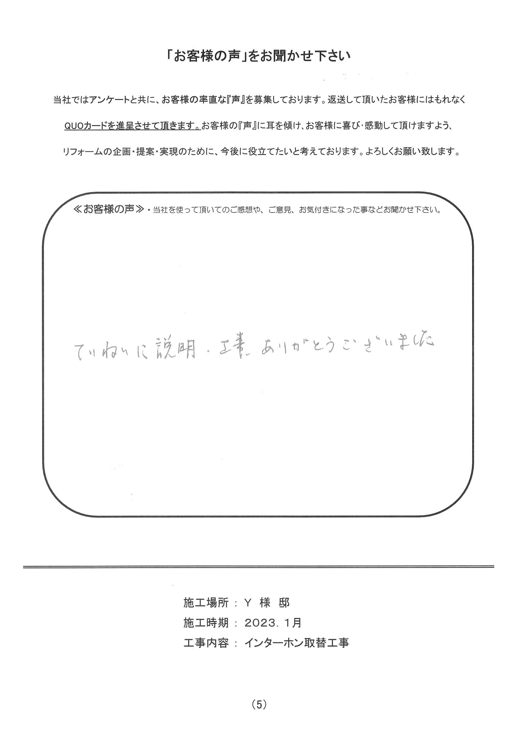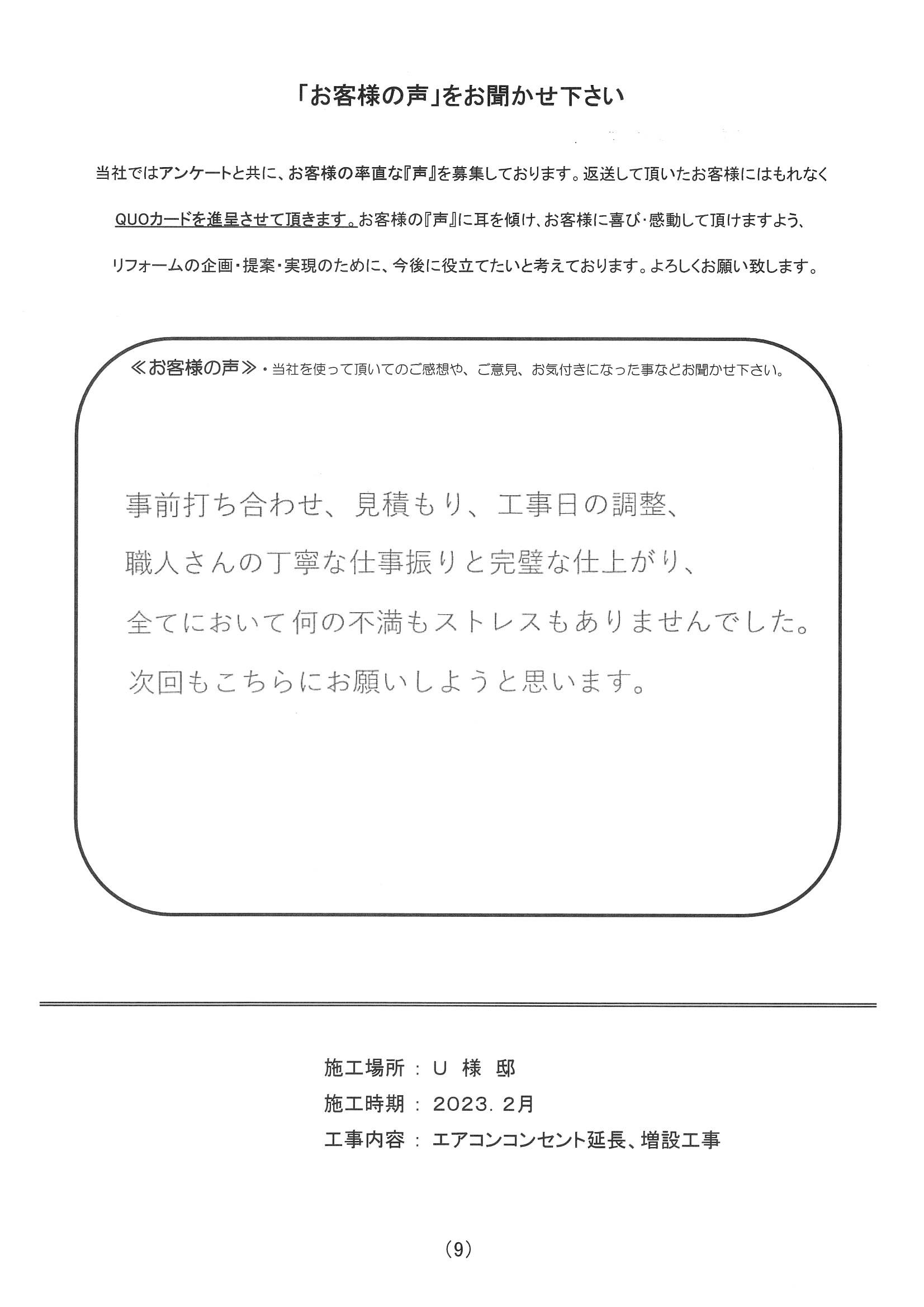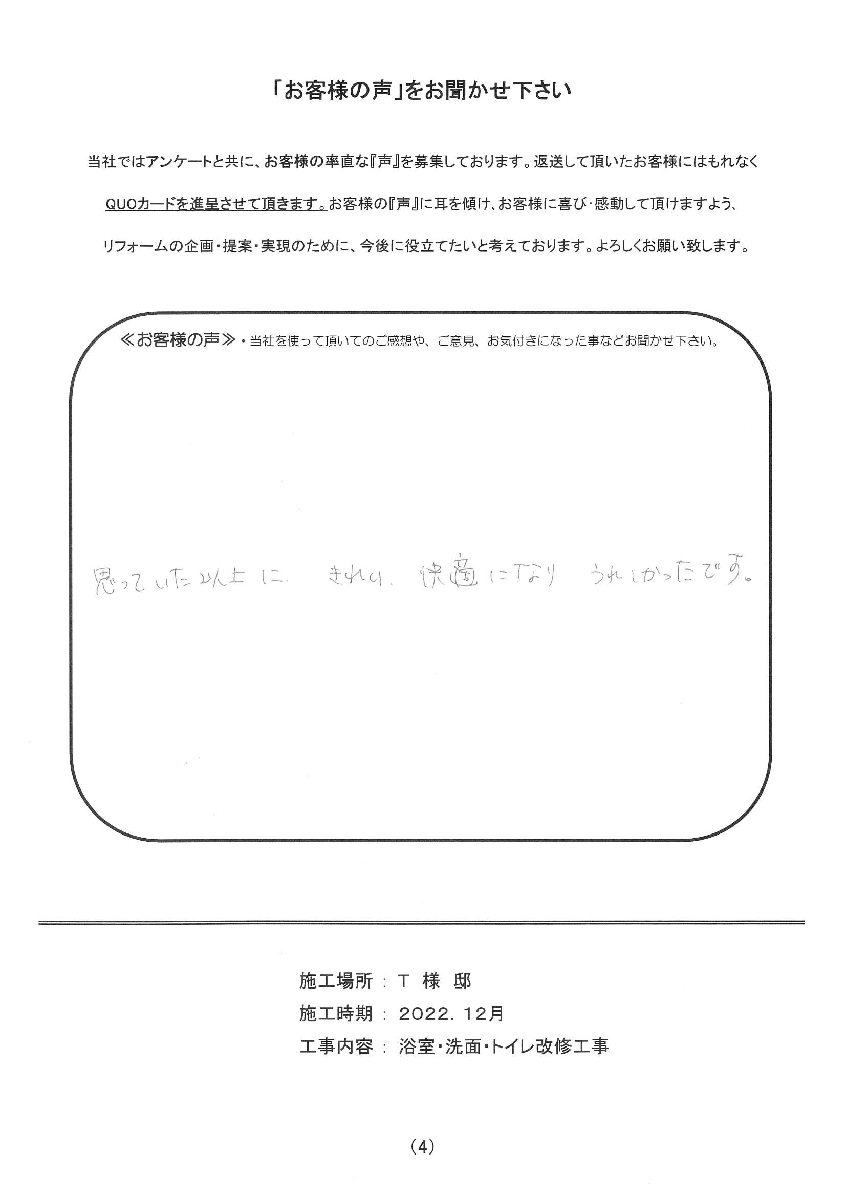 見積り依頼に対して、速やかに回答頂き工事迄の時間短縮に繋がったと思います。又、着工より完成迄がわずか一日半程度で済んだことで直ぐに日常生活に戻ることが出来、感謝しております。