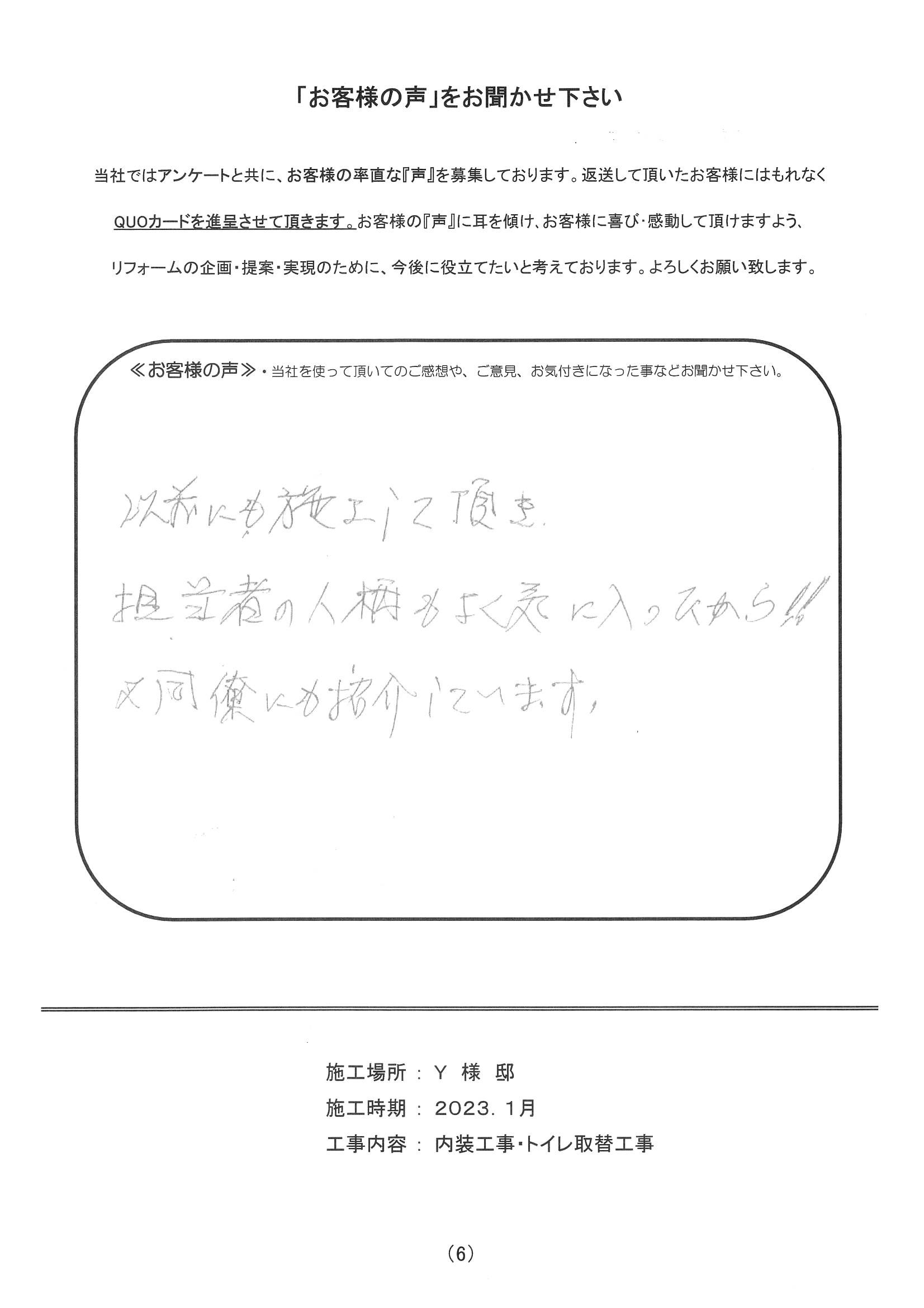 以前にも施工して頂き、担当者の人柄もよく気に入ったから!! 又、同僚にも紹介しています。