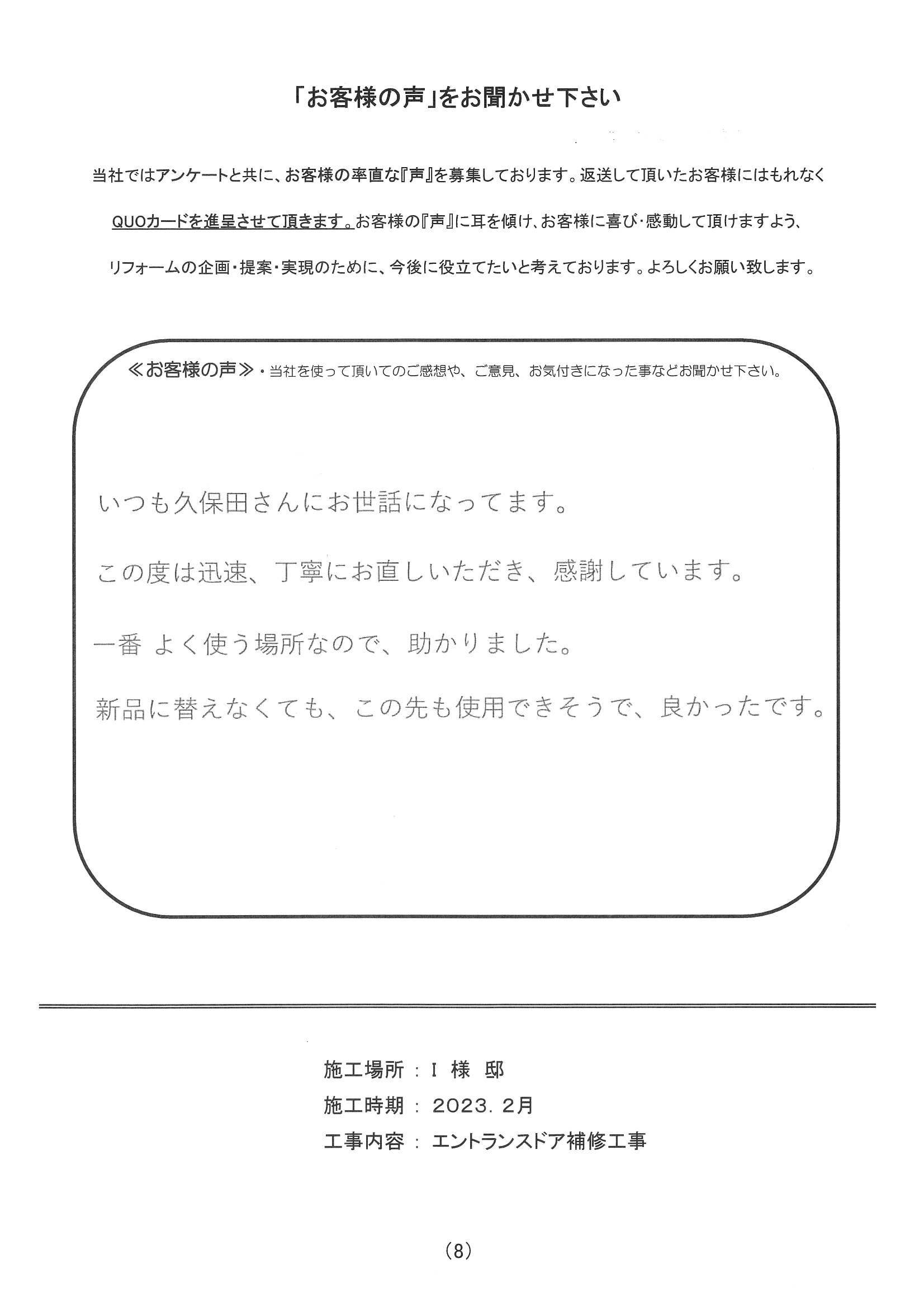 いつも久保田さんにお世話になってます。この度は迅速、丁寧にお直しいただき、感謝しています。一番よく使う場所なので、助かりました。新品に替えなくても、この先も使用できそうで、良かったです。