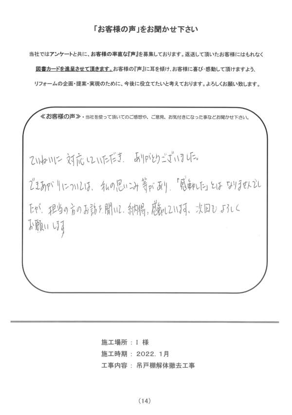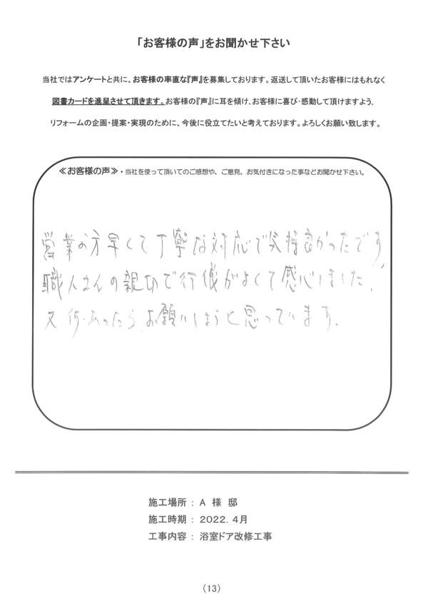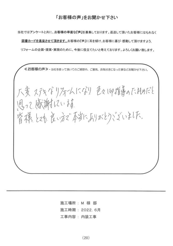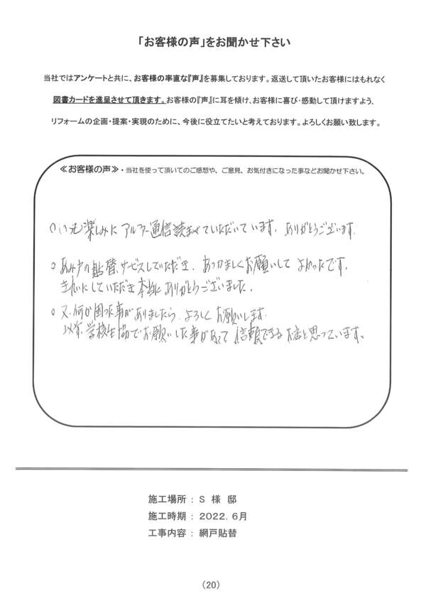 お客様よりアルファリフォームに届いたアンケートの一部をご紹介させて頂きます。