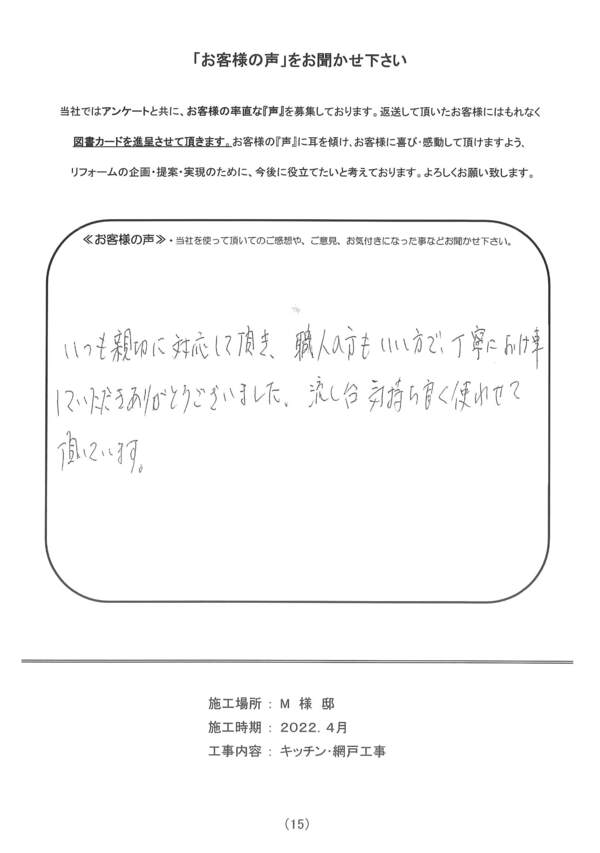 いつも親切に対応して頂き、職人の方もいい方で、丁寧にお仕事していただきありがとうございました。流し台気持ち良く使わせて頂いています。