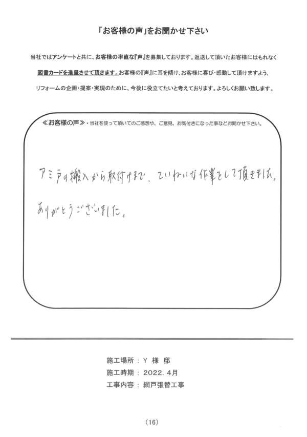 アミ戸の搬入から取付けまで、ていねいな作業をして頂きました。ありがとうございました。