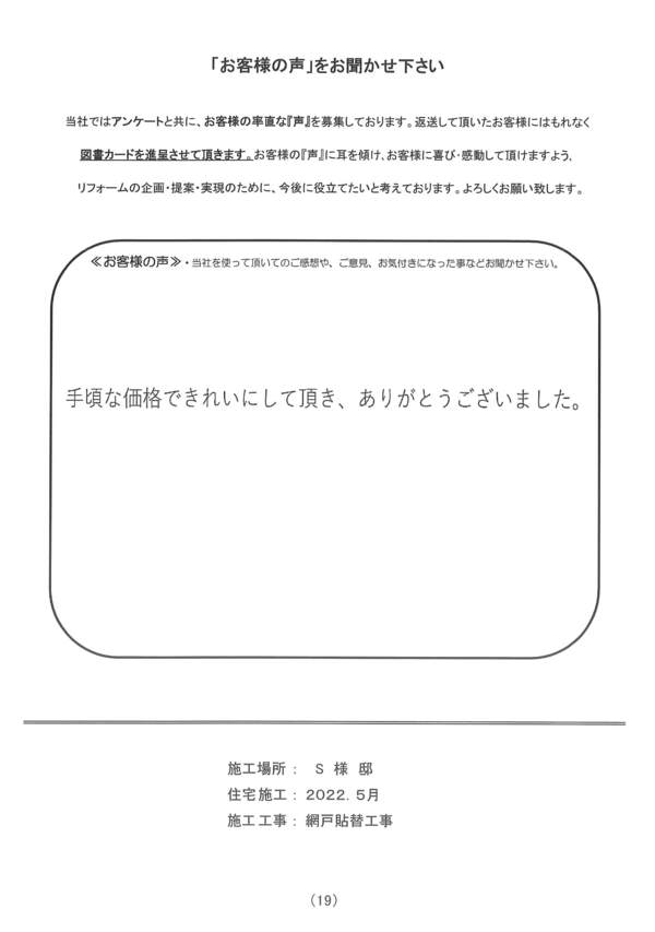 施工場所 S様邸 住宅形態 戸建て 施工時期 2022年6月 工事内容 網戸貼替