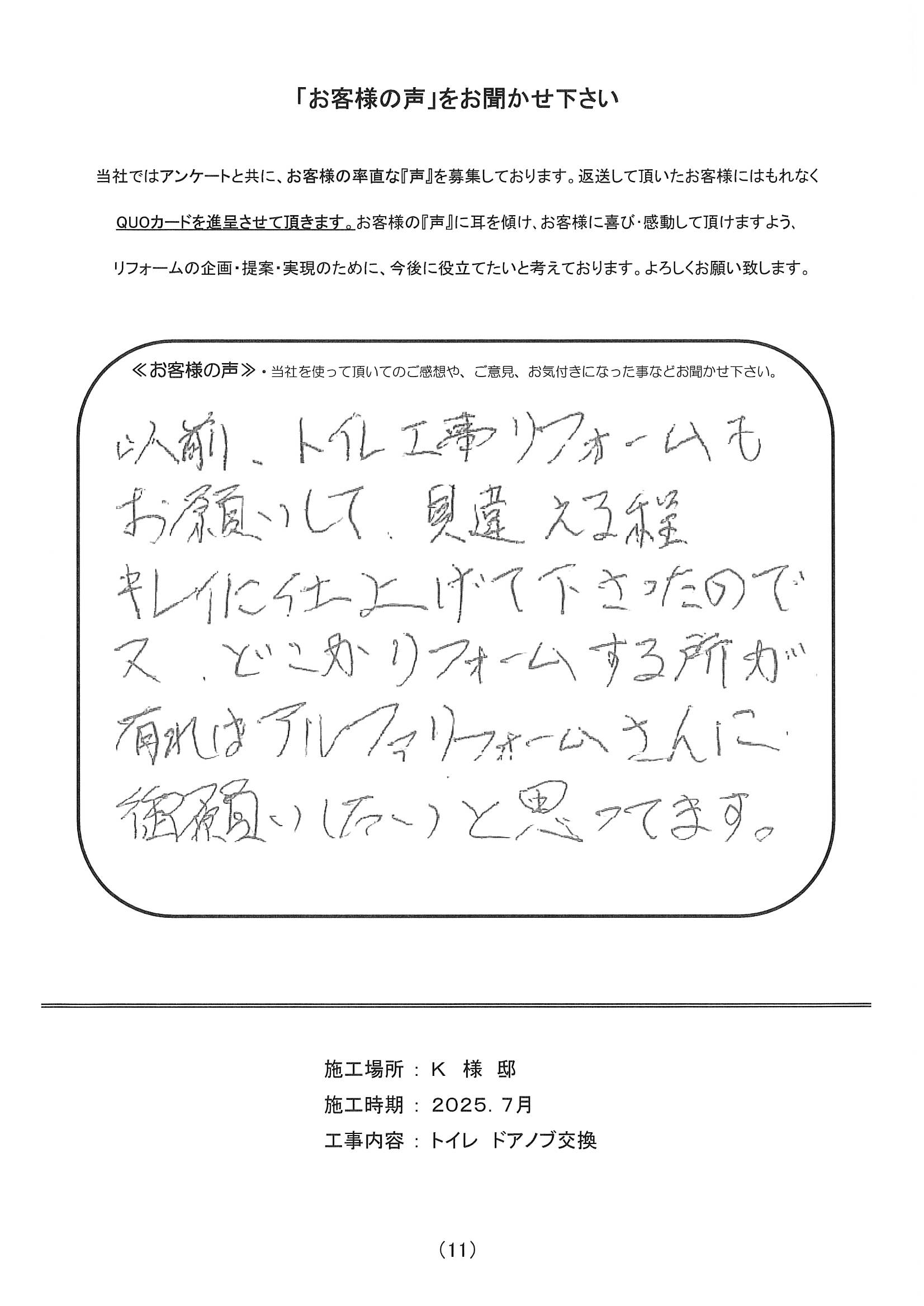 施工場所 K様邸 住宅形態 戸建て 施工時期 2025年7月 工事内容 トイレ ドアノブ交換