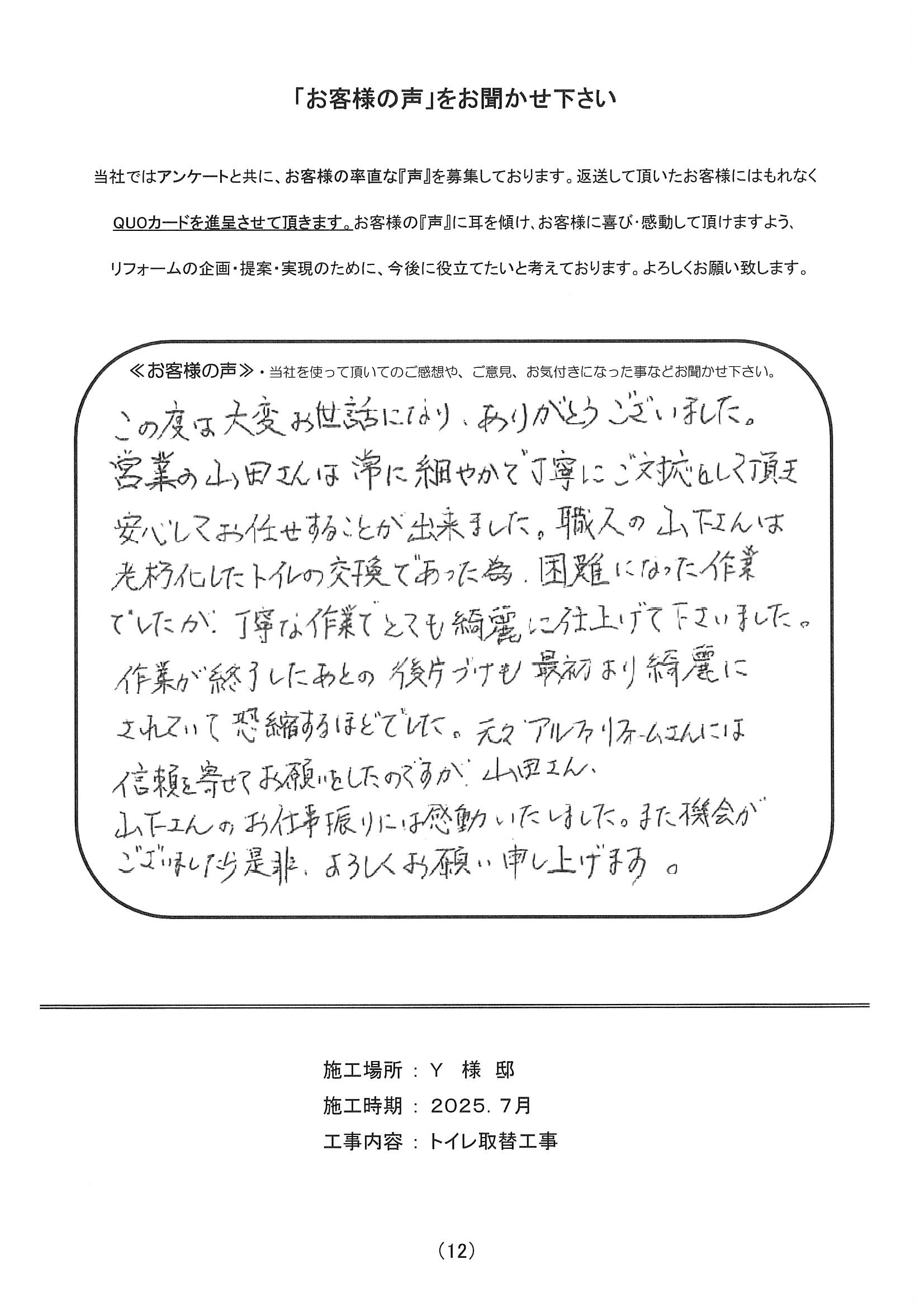 この度は大変お世話になり、ありがとうございました。営業の山田さんは常に細やかで丁寧にご対応をして頂き安心してお任せすることが出来ました。職人の山下さんは老朽化したトイレの交換であった為、困難になった作業でしたが、丁寧な作業でとても綺麗に仕上げて下さいました。作業が終了したあとの後片づけも最初よりきれいにされていて恐縮するほどでした。元々アルファリフォームさんには信頼を寄せてお願いをしたのですが、山田さん、山下さんのお仕事振りには感動いたしました。また機会がございましたら是非、よろしくお願い申し上げます。
