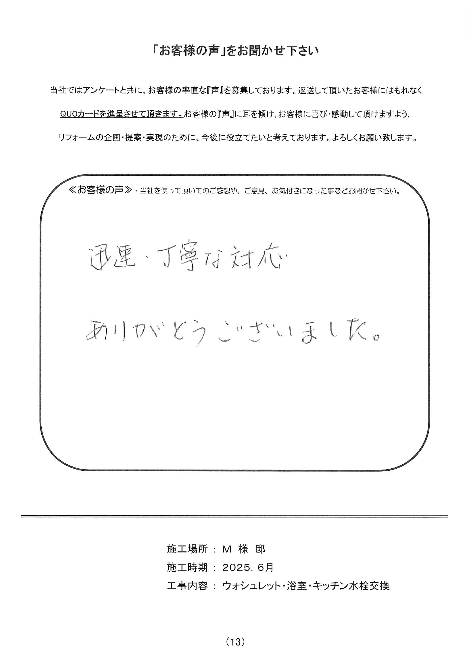 施工場所 M様邸 住宅形態 マンション 施工時期 2025年6月 工事内容 ウォシュレット・浴室・キッチン水栓交換