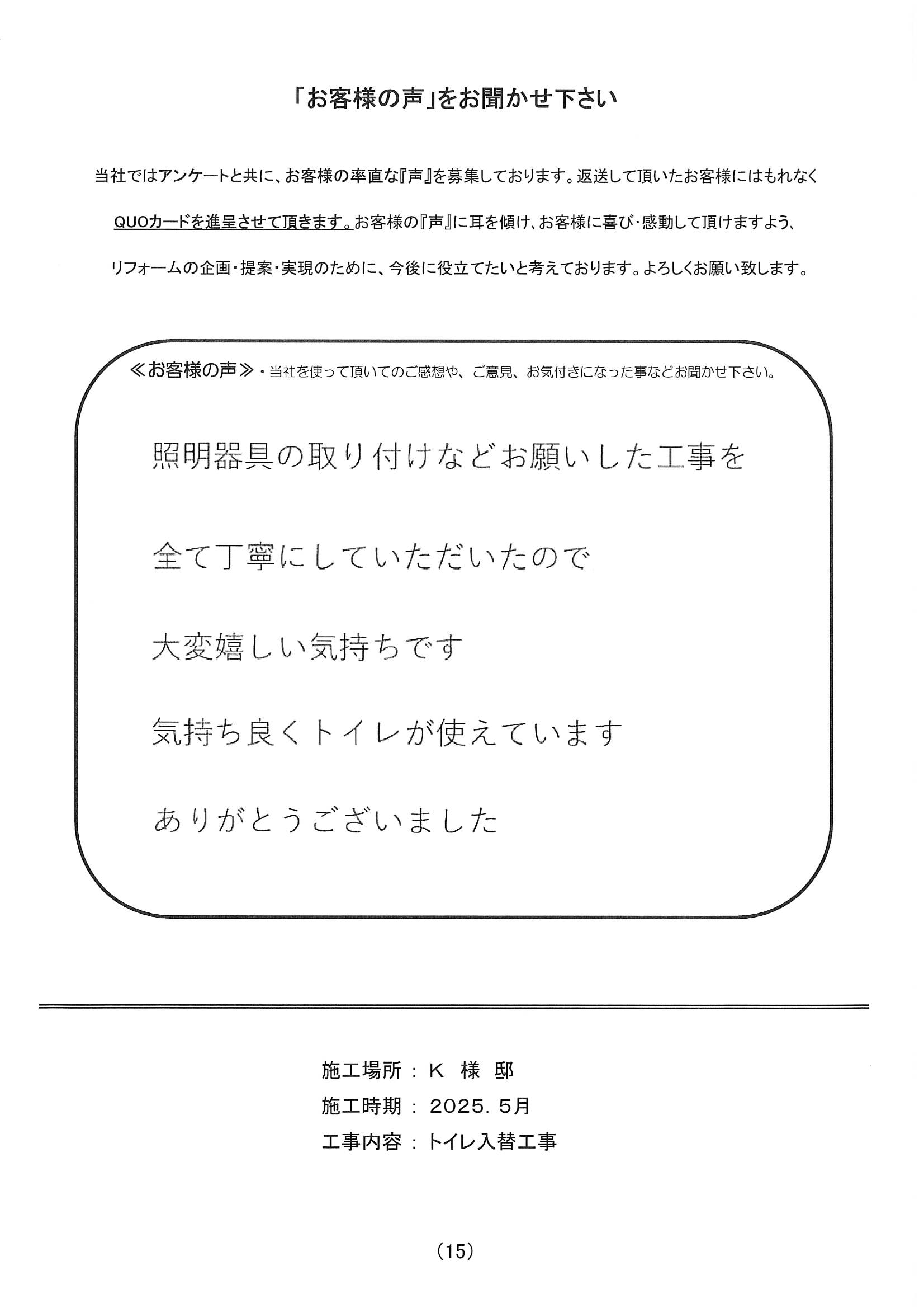 施工場所 K様邸 住宅形態 戸建て 施工時期 2025年5月 工事内容 トイレ入替工事