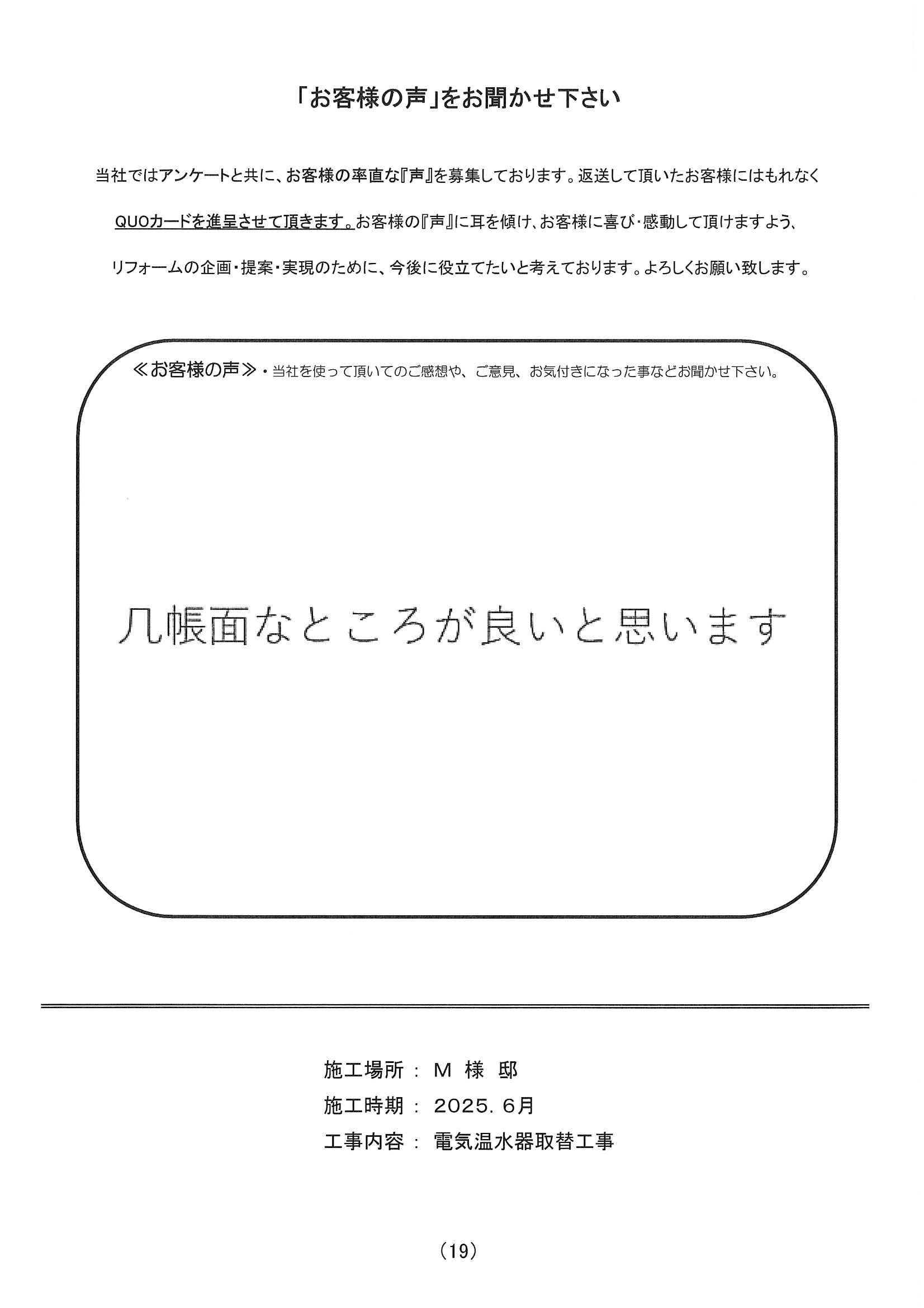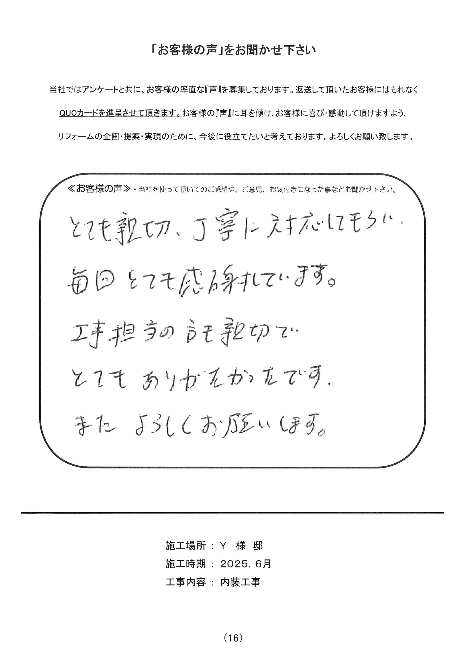 とても親切、丁寧に対応してもらい、毎回とても感謝しています。工事担当の方も親切でとてもありがたかったです。またよろしくお願いします。