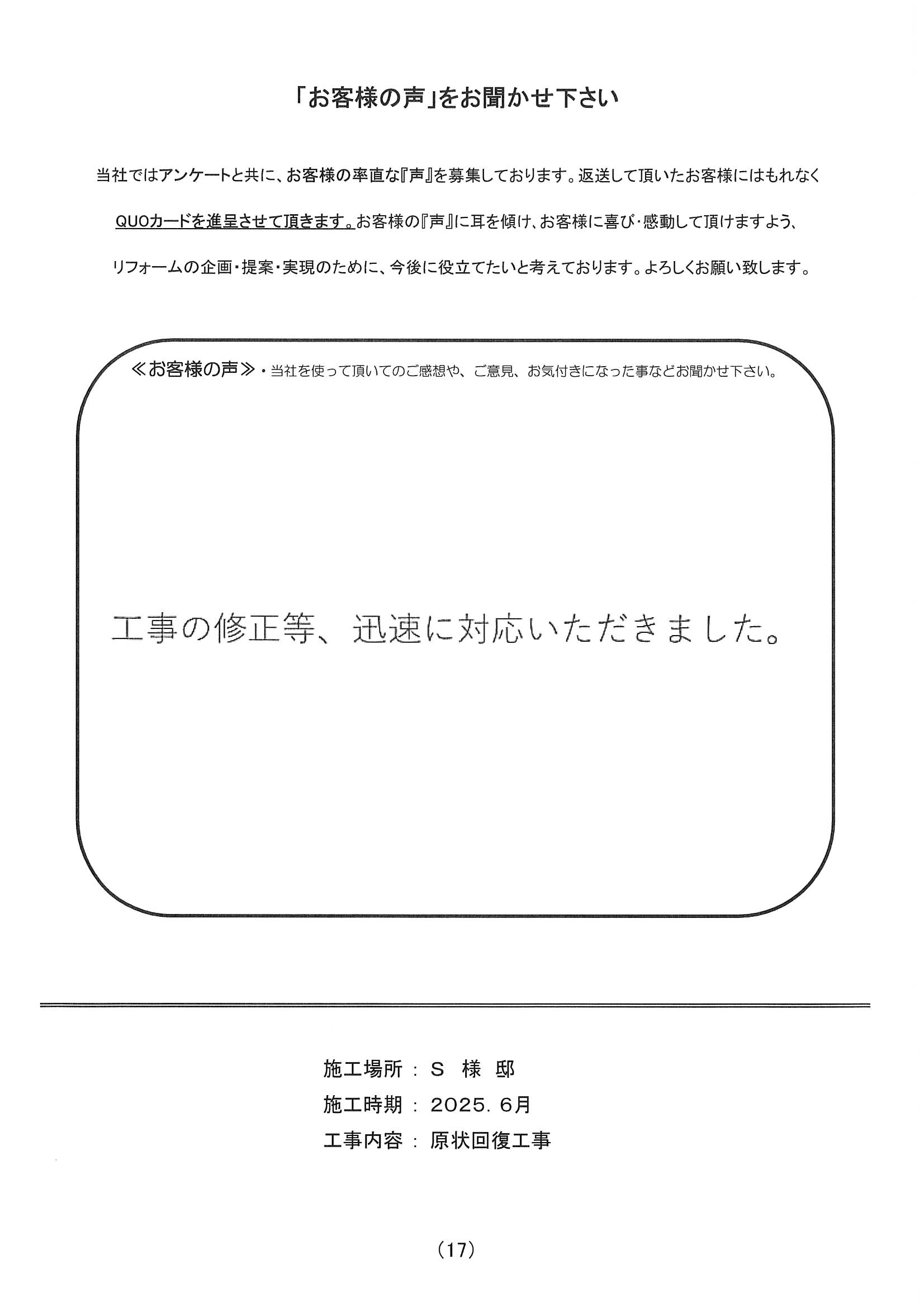 施工場所 S様邸 住宅形態 マンション 施工時期 2025年6月 工事内容 原状回復工事