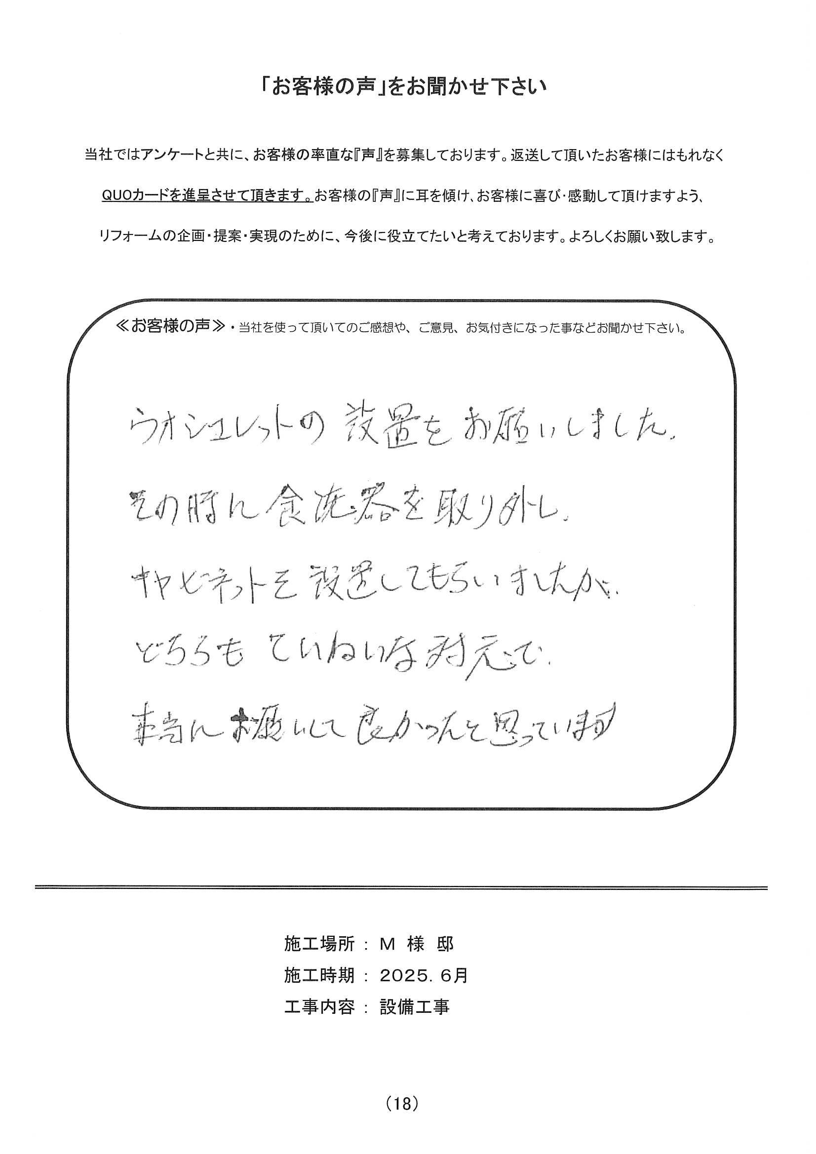 ウォシュレットの設置をお願いしました。その時に食洗器を取り外し、キャビネットを設置してもらいましたが、どちらもていねいな対応で本当にお願いして良かったと思っています。