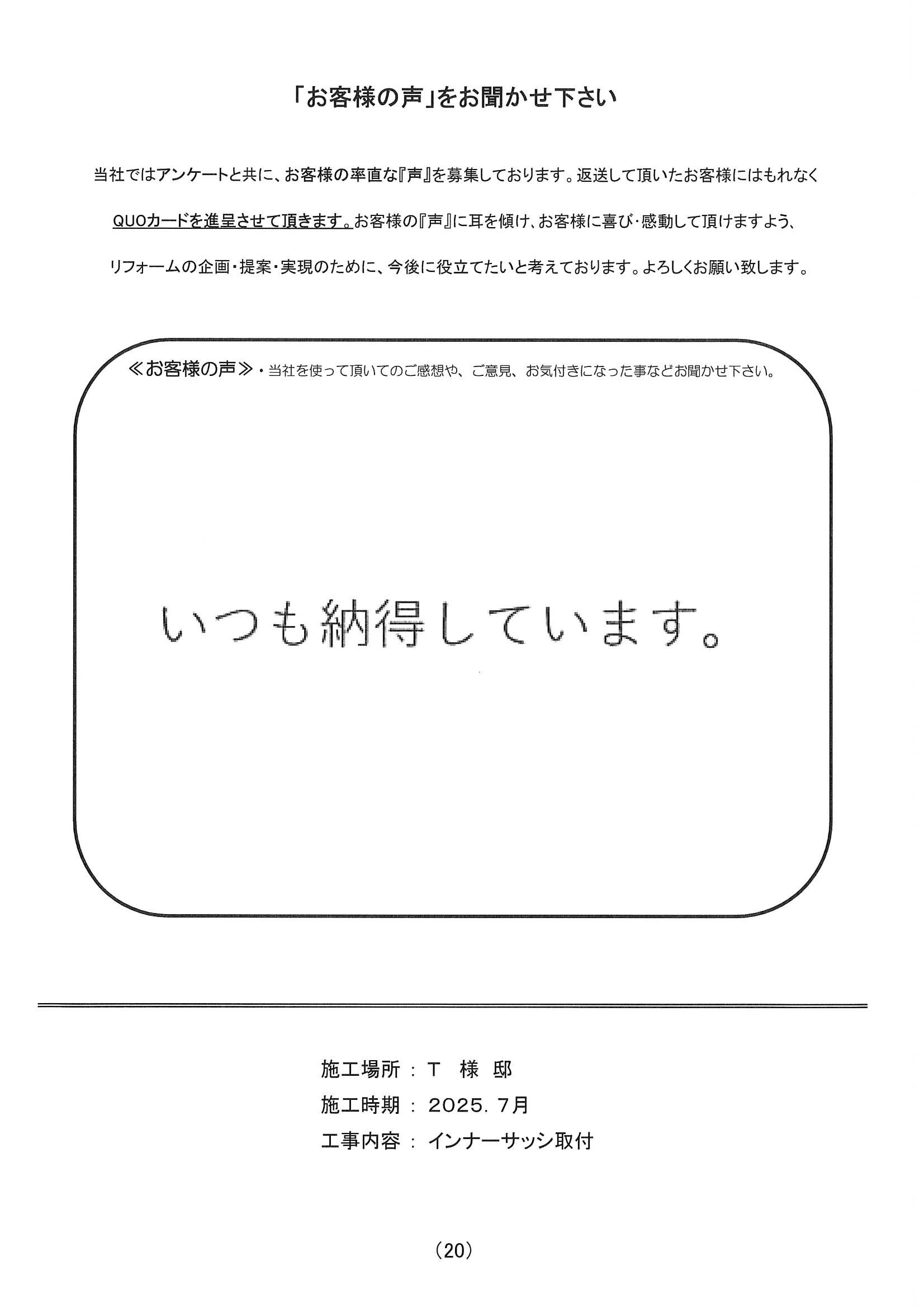 施工場所 T様邸 住宅形態 マンション 施工時期 2025年7月 工事内容 インナーサッシ取付