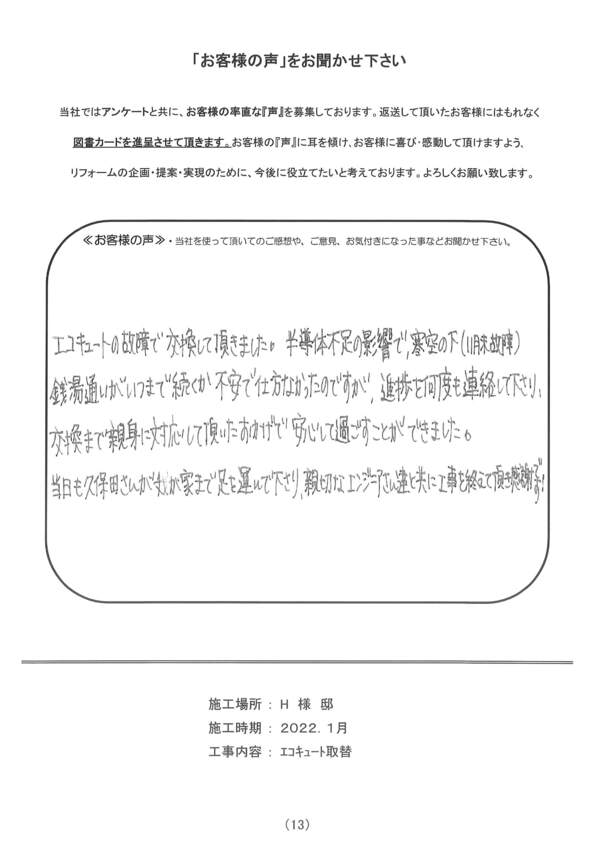 施工場所 H様邸 住宅形態 戸建て 施工時期 2022年1月 工事内容 エコキュート取替