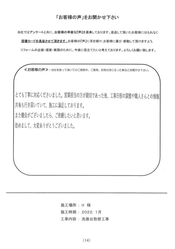 施工場所 H様邸 住宅形態 戸建て 施工時期 2022年1月 工事内容 洗面台取替工事