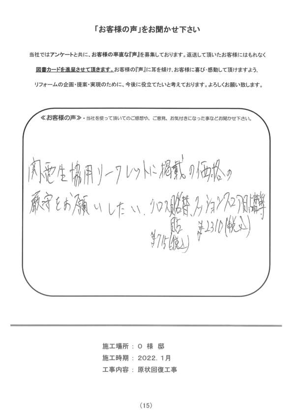 関電生協用リーフレットに掲載の価格の厳守をお願いしたい。クロス張替¥715(税込)クッションフロア張替等¥2310(税込)