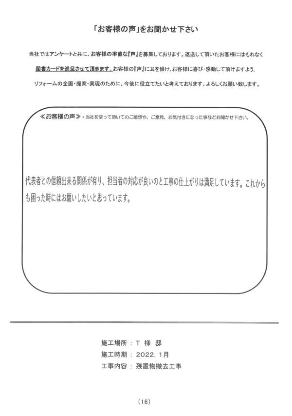 施工場所 T様邸 住宅形態 戸建て 施工時期 2022年1月 工事内容 残置物撤去工事