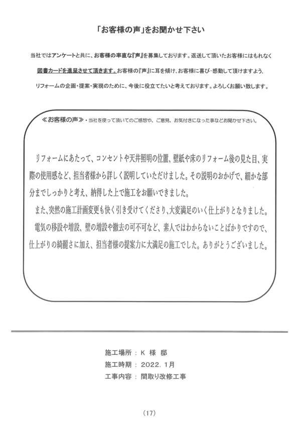 お客様よりアルファリフォームに届いたアンケートの一部をご紹介させて頂きます。