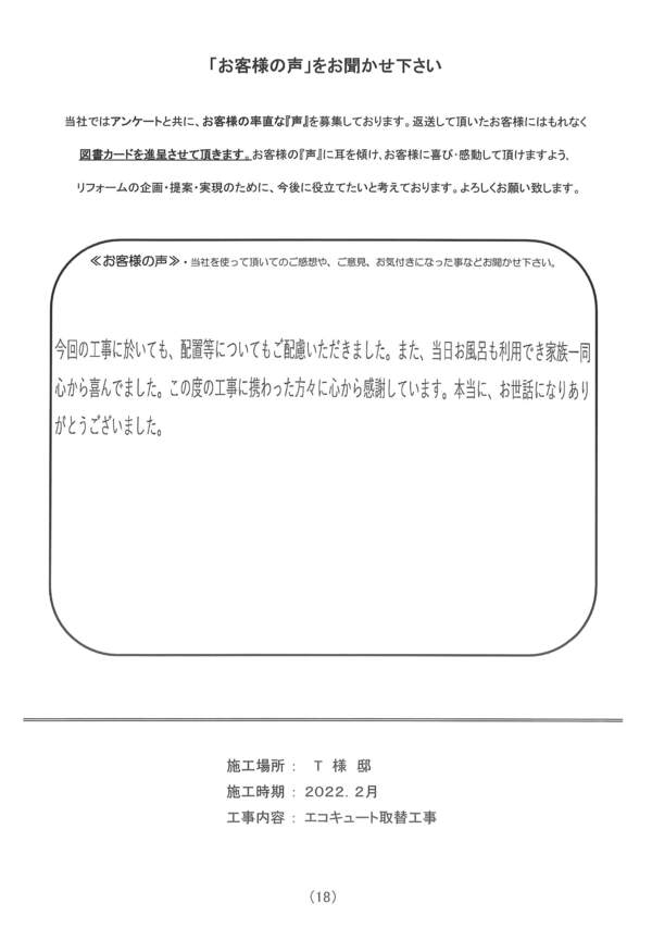 今回の工事に於いても、配置等についてもご配慮いただきました。また、当日お風呂も利用でき家族ー同心から喜んでました。この度の工事に携わった方々に心から感謝しています。本当に、お世話になりあリ がとうございました。