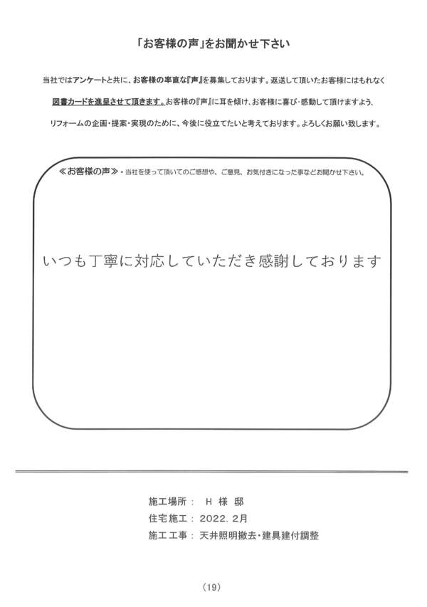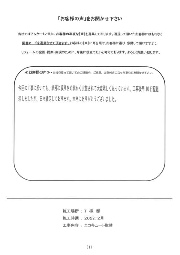 今回の工事に於いても、細部に渡りきめ細かく実施されて大変嬉しく思っています。事後早10日程経過しましたが、日々満足しております。本当にありがとうございまに