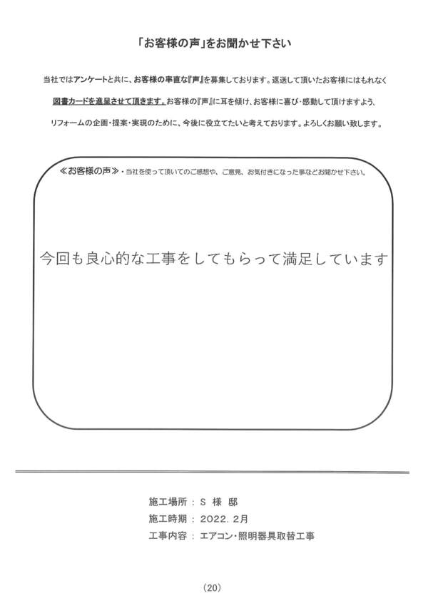 施工場所 S様邸 住宅形態 マンション 施工時期 2022年2月 工事内容 エアコン・照明器具取替工事