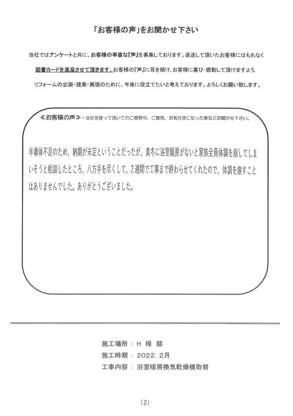 施工場所 H様邸 住宅形態 戸建て 施工時期 2022年2月 工事内容 浴室暖房換気乾燥機取替