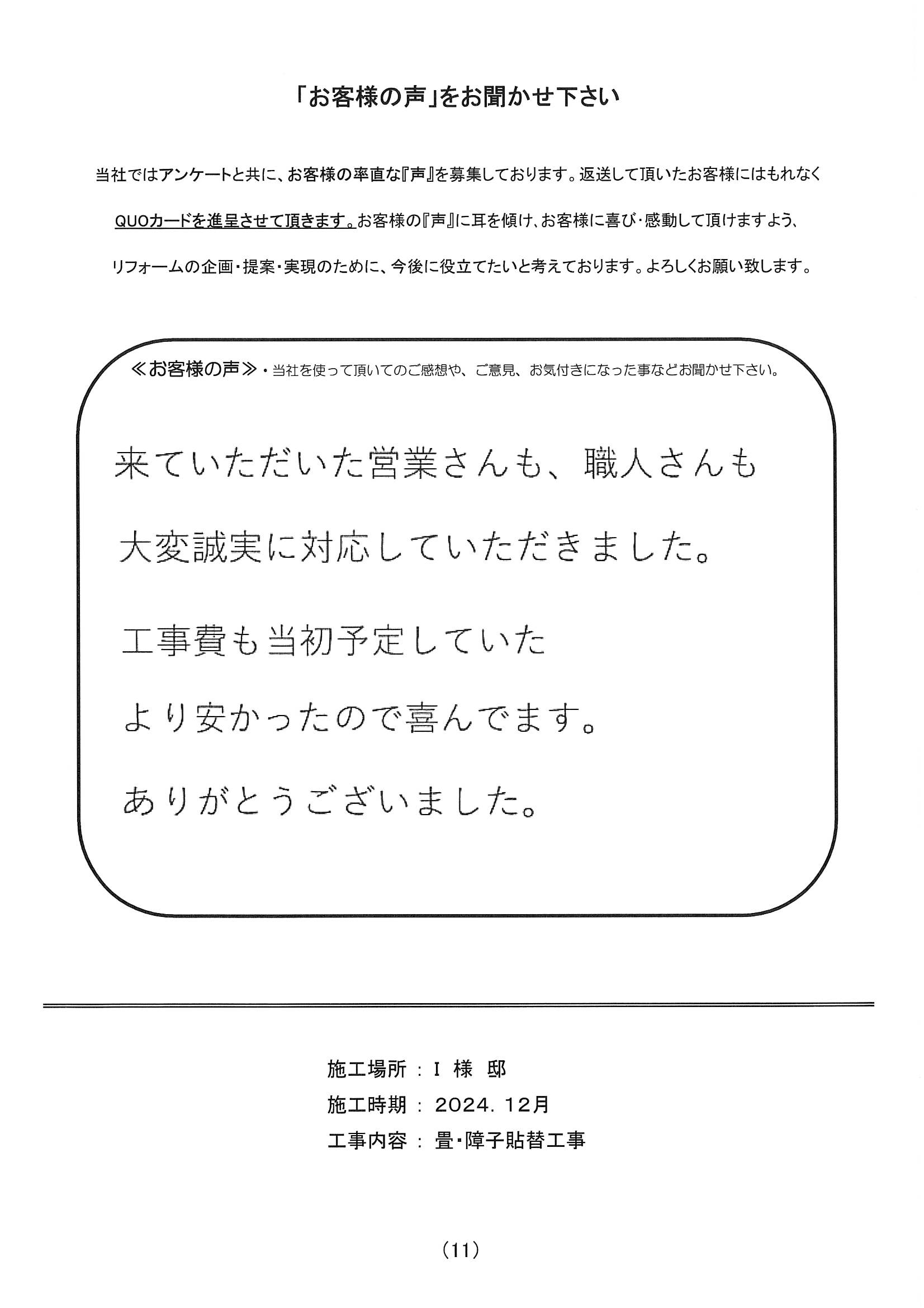 施工場所 I様邸 住宅形態 戸建て 施工時期 2024年12月 工事内容 畳・障子貼替工事