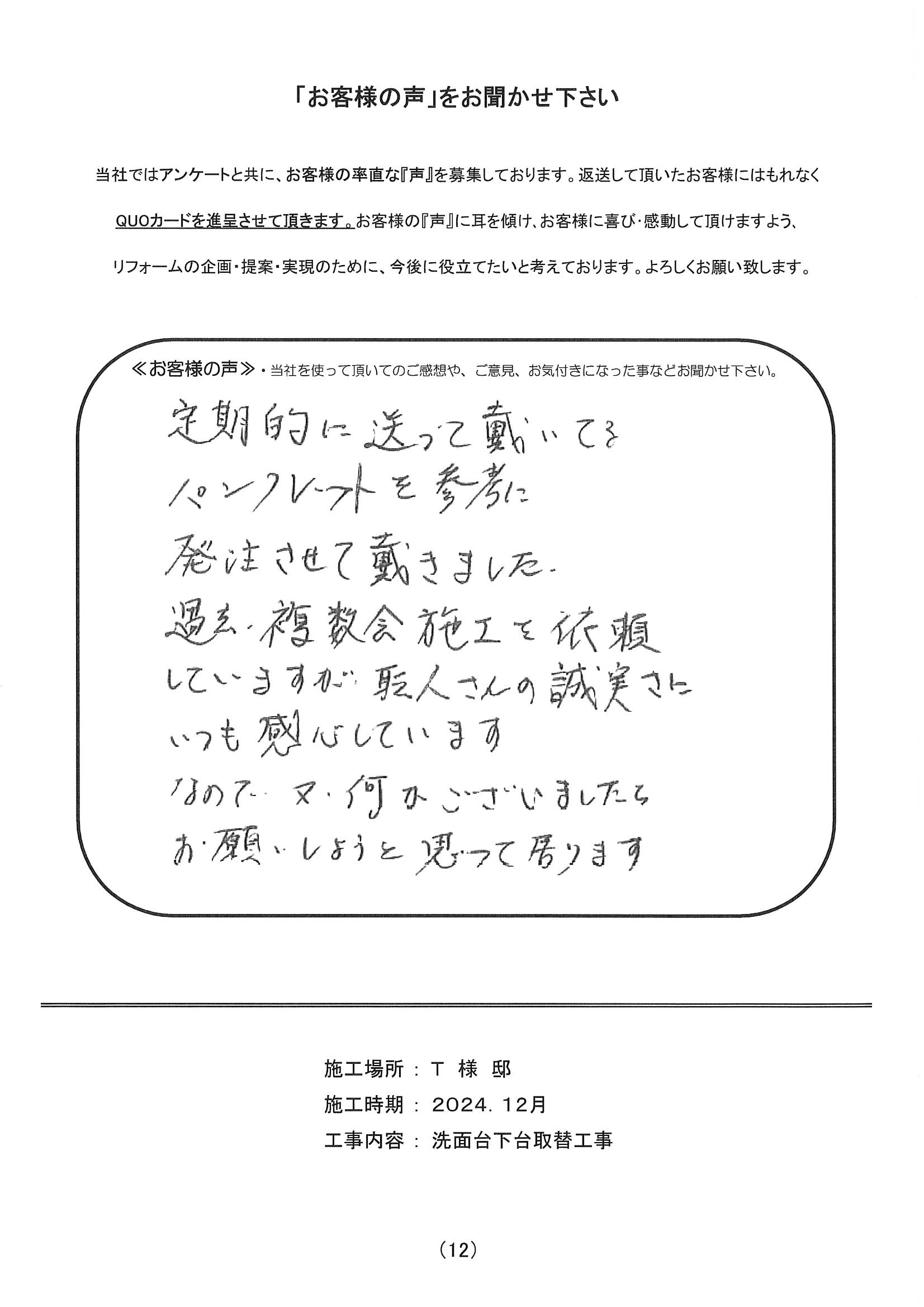 定期的に送って戴いているパンフレットを参考に発注させて戴きました。過去、複数回施工を依頼していますが、職人さんの誠実さにいつも感心しています。なので、又何かございましたらお願いしようと思って居ります。