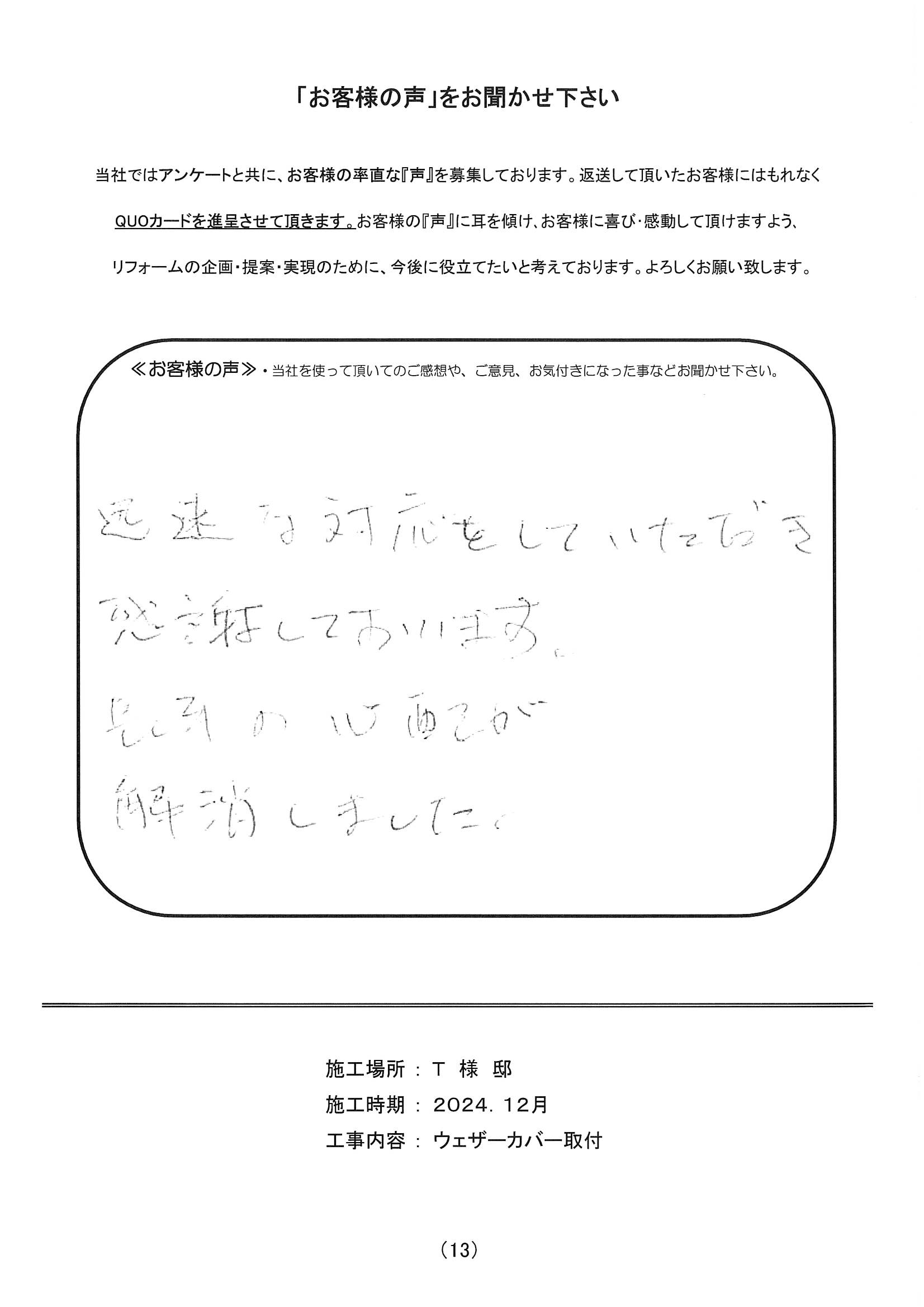 施工場所 T様邸 住宅形態 戸建て 施工時期 2024年12月 工事内容 ウェザーカバー取付