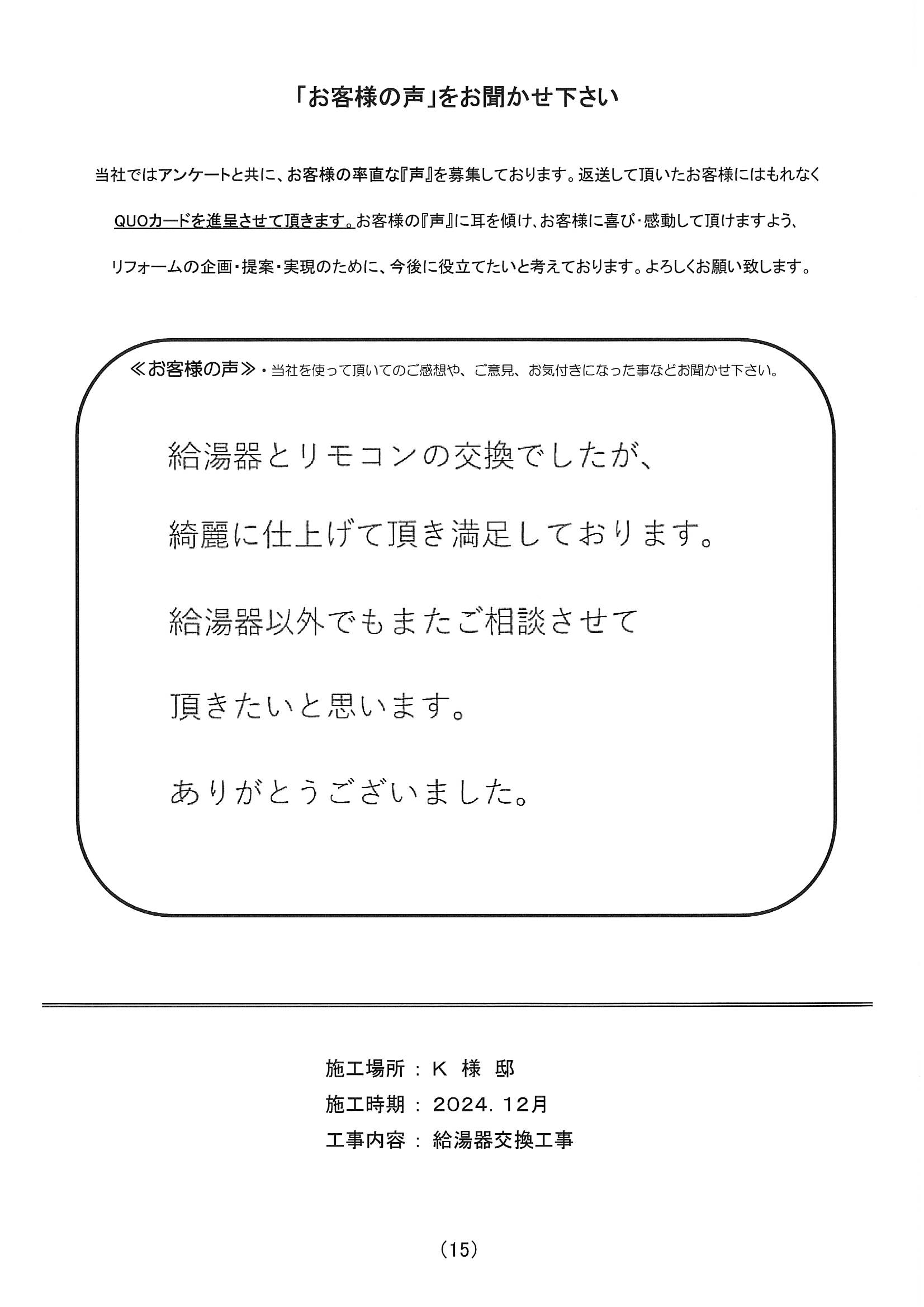 給湯器とリモコンの交換でしたが、綺麗に仕上げて頂き満足しております。給湯器以外でもまたご相談させて頂きたいと思います。ありがとうございました。
