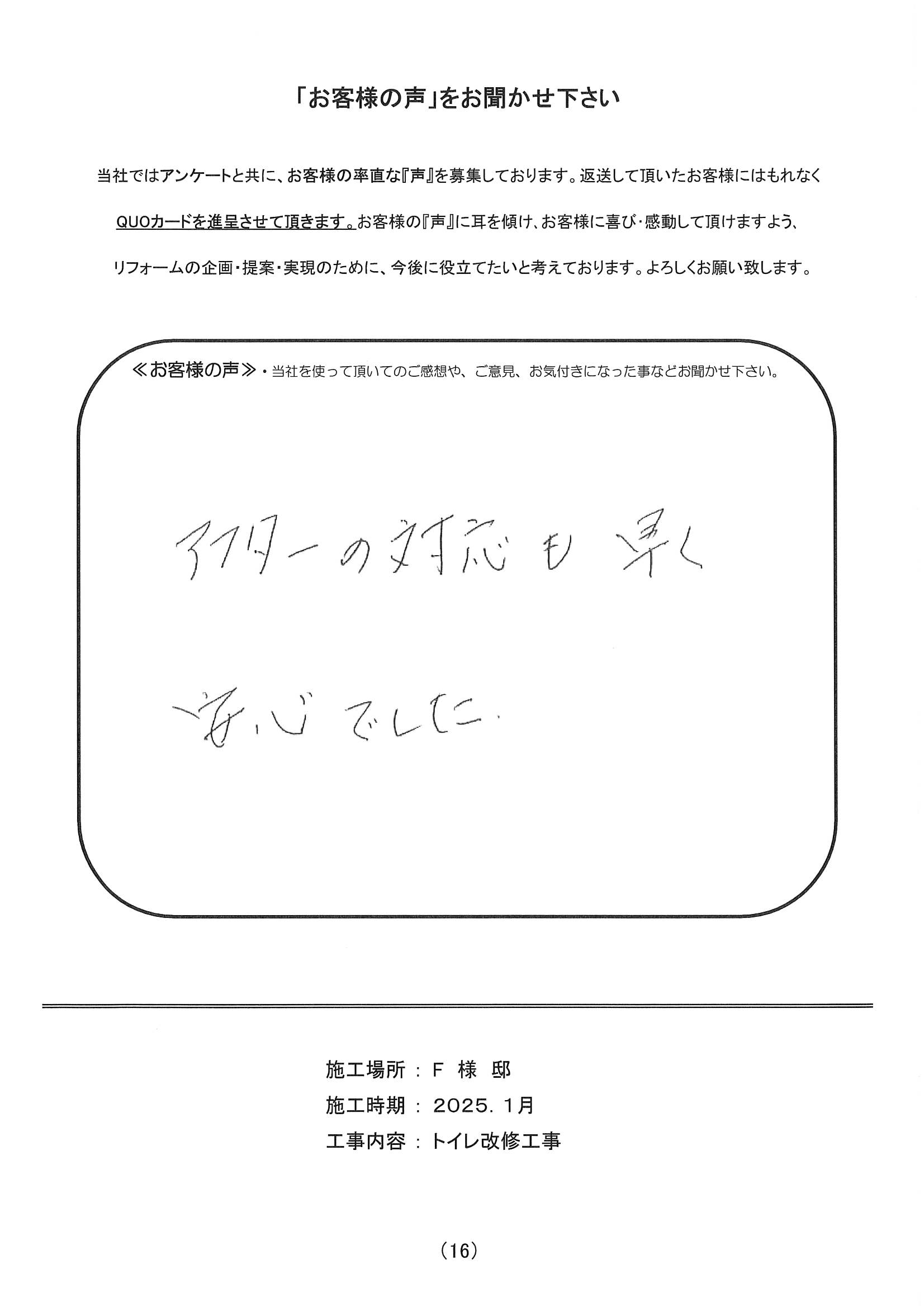 アルファリフォームを使って頂いたご感想・他店との違いなどを記入していただきました。