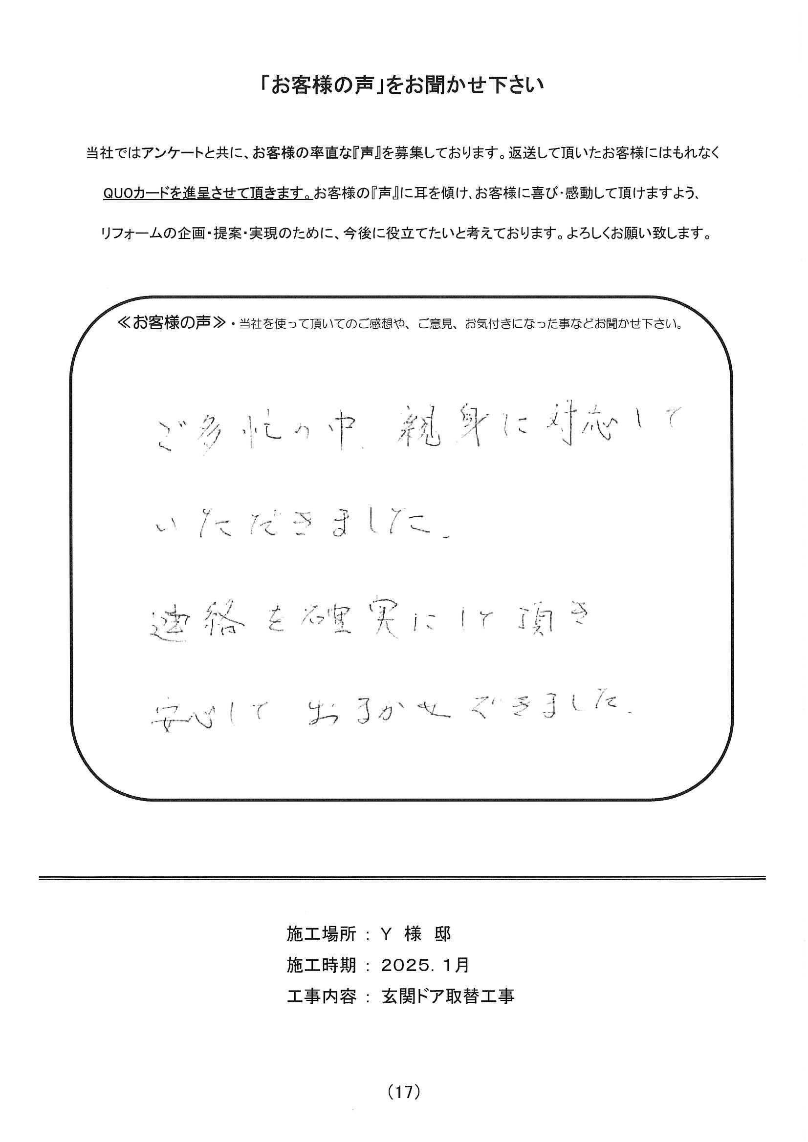 ラインでのやりとり、とてもわかりやすく工事後の気になる部分の連絡に対しすぐに対応して下さりありがとうございました。