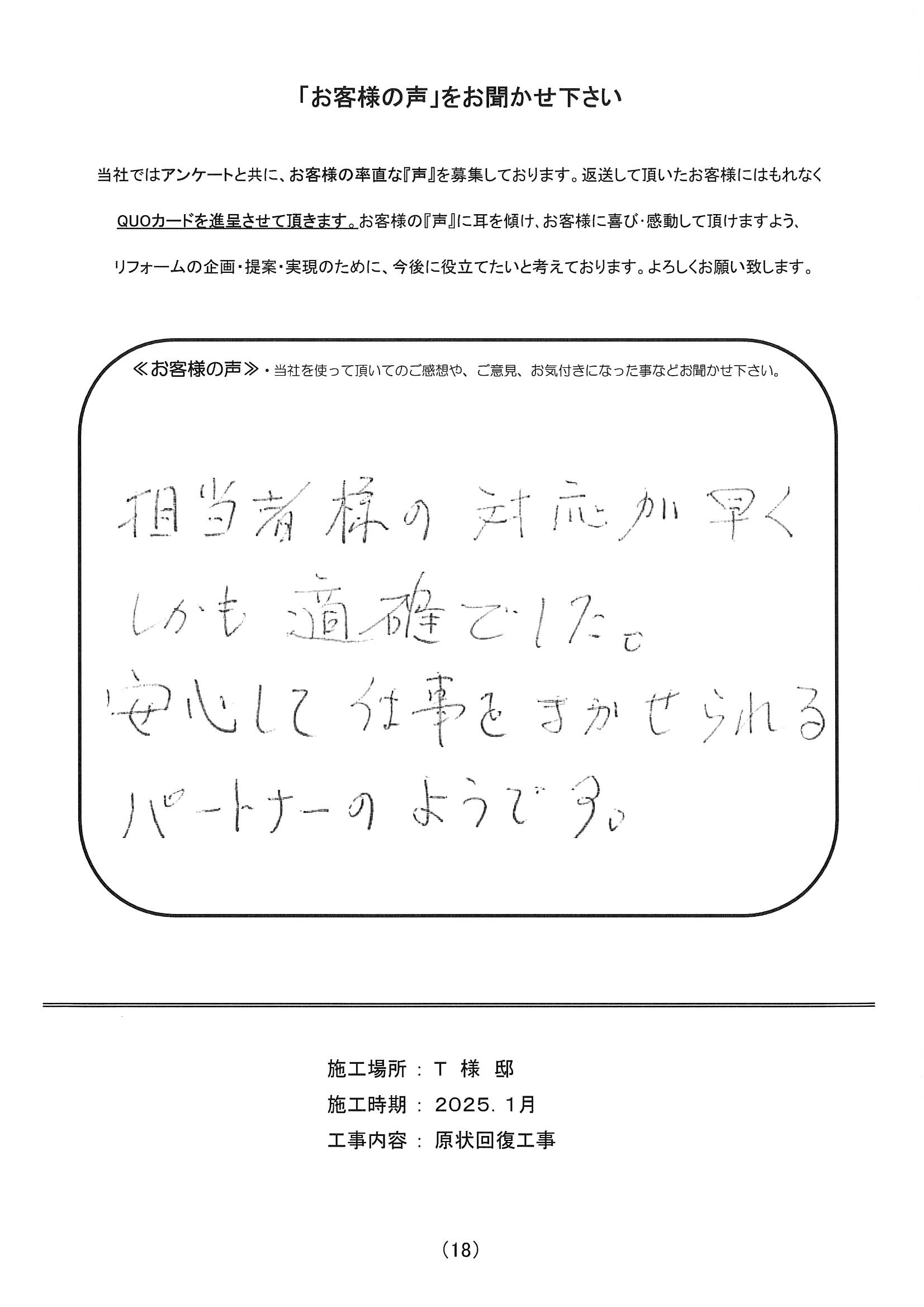 迅速な対応をしていただき感謝しております。長年の心配が解消しました。